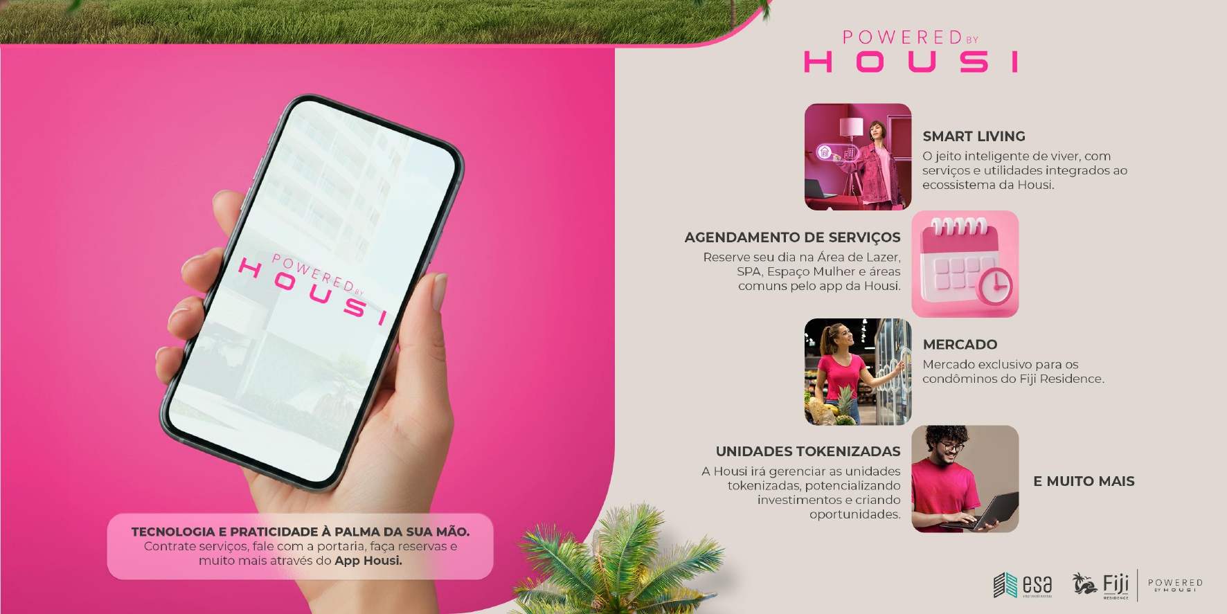 Um dos grandes diferenciais do Fiji Residence é a integração com a plataforma Housi, que permite serviços sob demanda, mercado interno, lavanderia compartilhada e unidades tokenizadas — ampliando o potencial de rentabilidade para investidores e a comodidade para moradores.