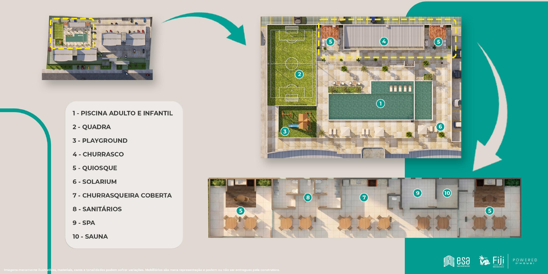 A infraestrutura do condomínio também contempla vagas para visitantes, carregadores para carros elétricos, portaria 24h e áreas comuns pensadas para o uso inteligente e sustentável.