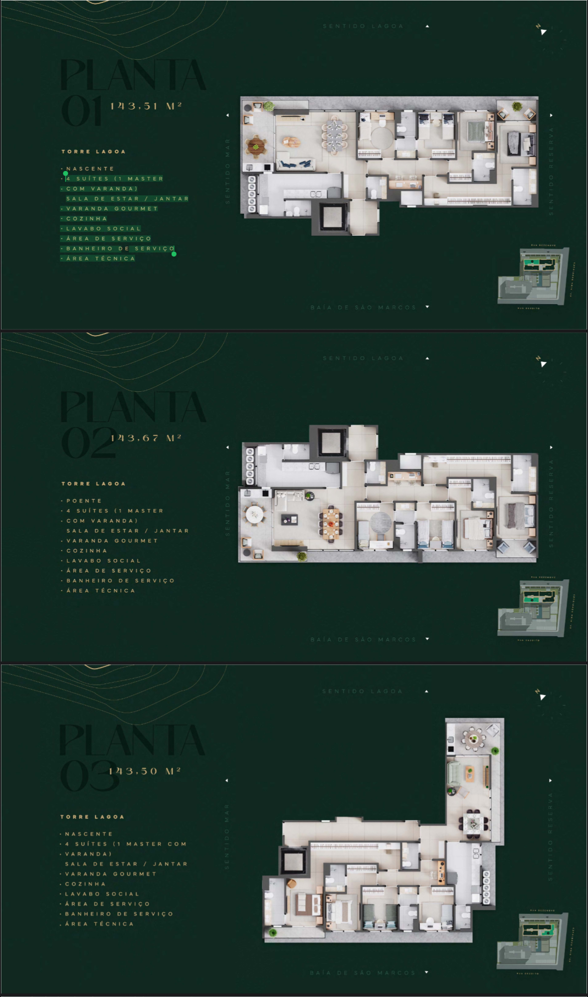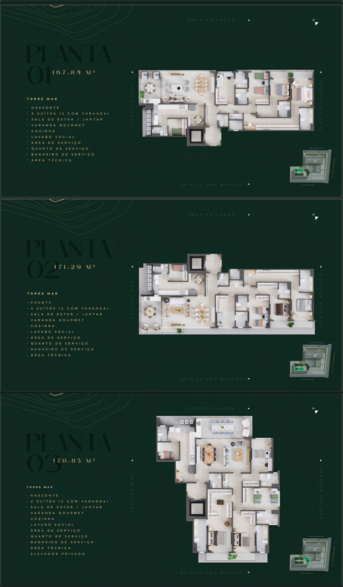 Características: duas unidades de alto padrão disponíveis no Reserva Península, com 143m² e 171m², ambas compostas por 4 suítes (sendo 1 master com varanda), sala de estar e jantar, varanda gourmet, cozinha, lavabo social, área de serviço, banheiro de serviço e área técnica. Ambientes amplos, com móveis planejados, piso porcelanato, teto em gesso e pé-direito alto.