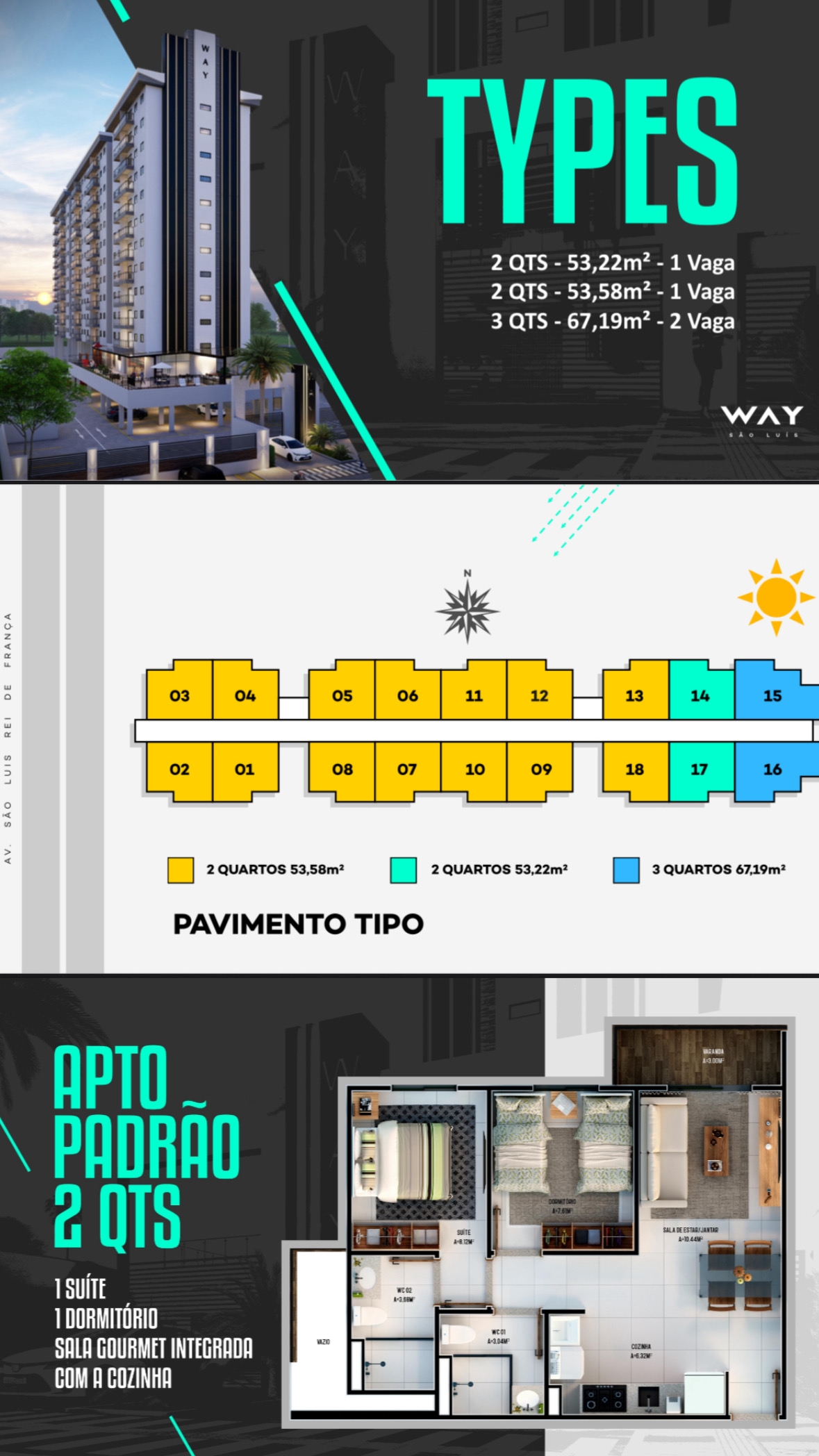 3 quartos (1 suíte + 2 quartos), cozinha americana integrada, 67m², 2 vagas de garagem